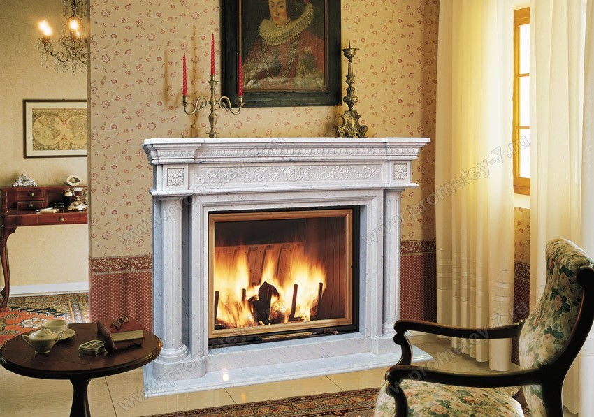 Фронтальный каминный портал Родос выполнен из мрамора. Изготовлен он вручную по индивидуальному проекту.